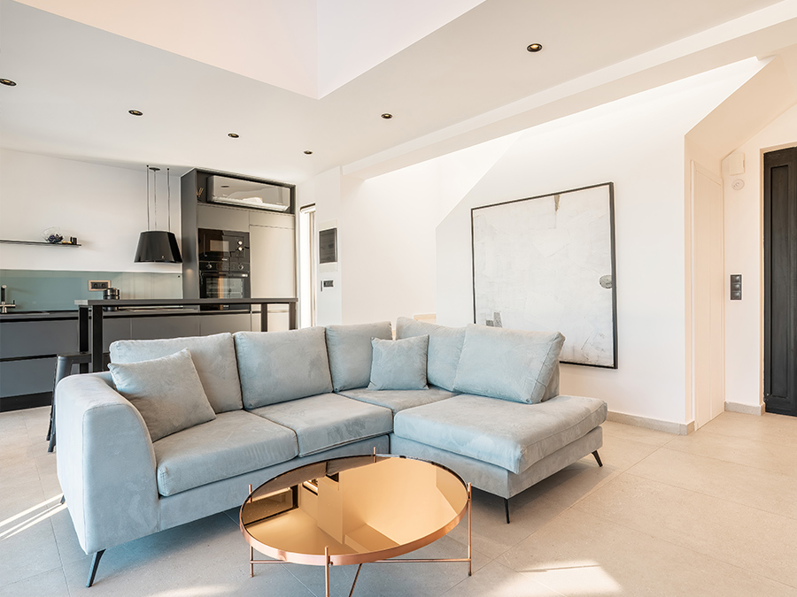 The lounge area has an L shaped sofa, a modern coffee table, and a 65-inch Samsung OLED smart tv connected to the WIFI. Satellite and OTE pay Tv channels are available.