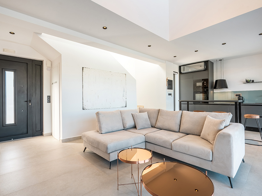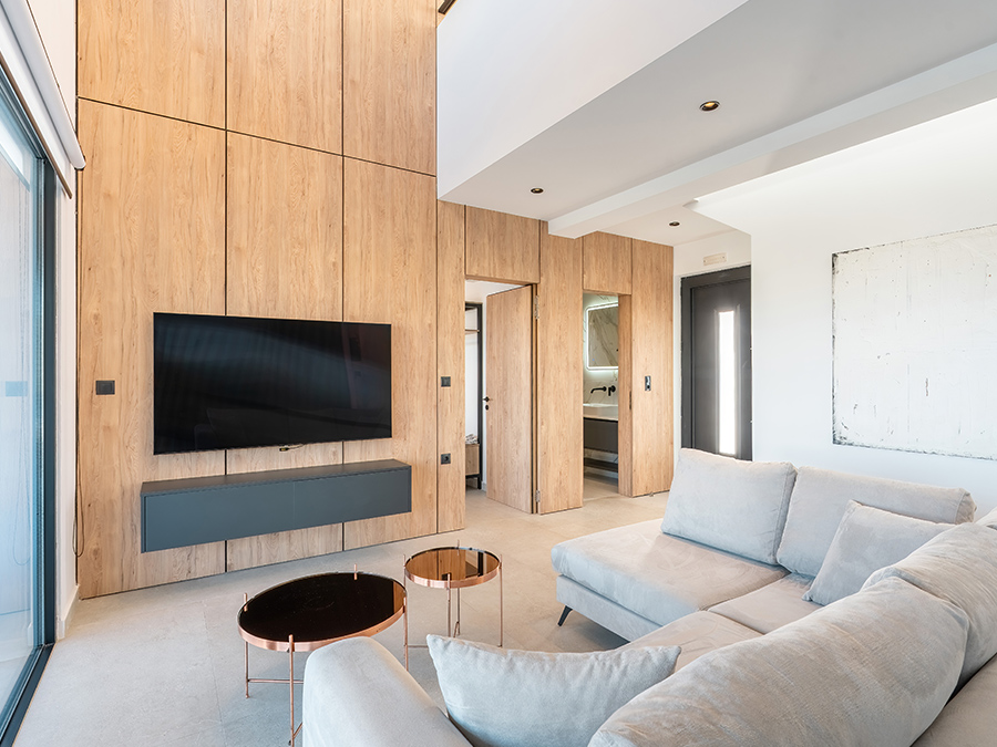 The lounge area has an L shaped sofa, a modern coffee table, and a 65-inch Samsung OLED smart tv connected to the WIFI. Satellite and OTE pay Tv channels are available.