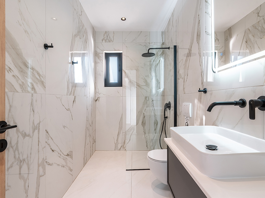 Each villa has 2 bathrooms with all modern amenities, a built in storage space containing the washing machine, an ironing board and other equipment. Each villa has parking spaces, a security gate and cameras.