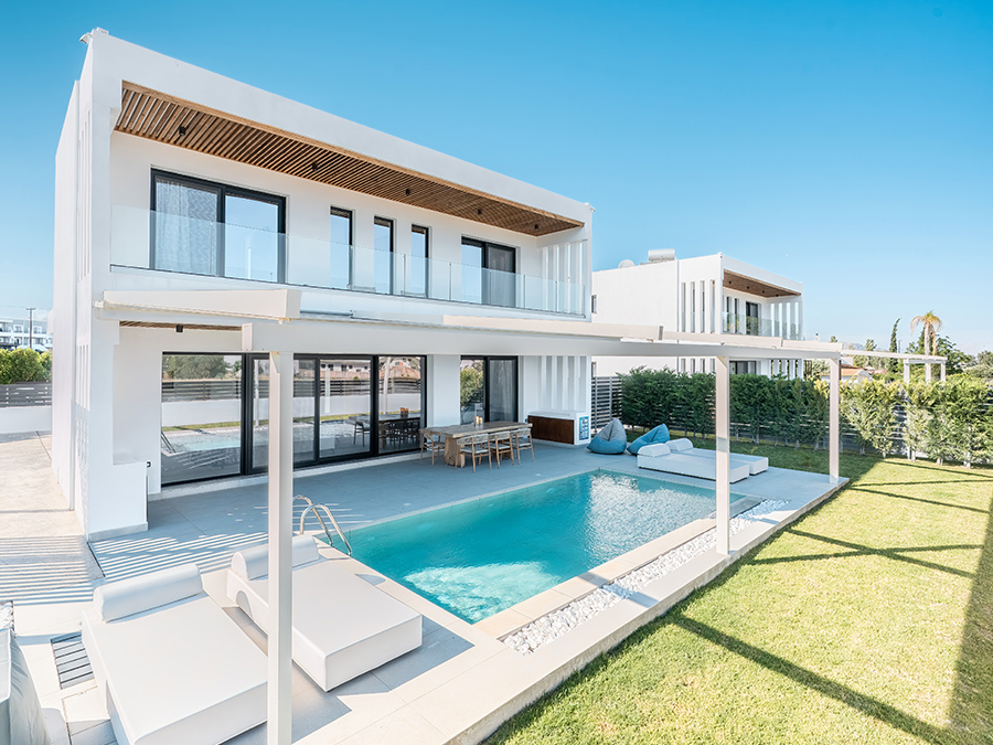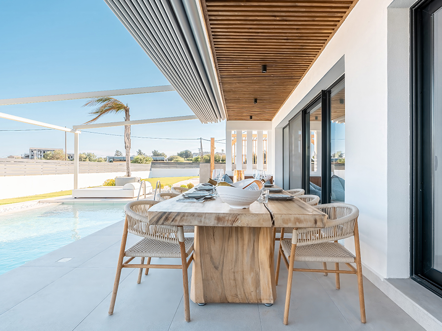 D&R Boutique Villas are modernly designed, 2023 built, fully furnished, and equipped with brand new appliances. Each 2-story villa has a BBQ area, an outdoor heated swimming pool, and a shower with 4 sunbeds. The large outdoor dining area consists of an elegant natural wooden 2.5-meter dining table and 8 wooden chairs. The villas are separated by a 1.8m fence and garden for privacy.