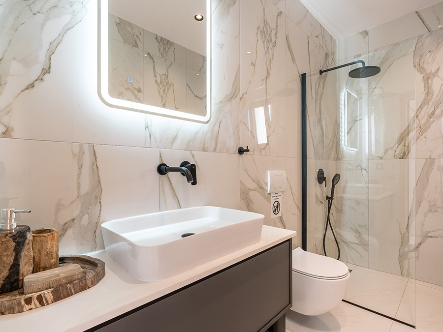 Each villa has 2 bathrooms with all modern amenities, a built in storage space containing the washing machine, an ironing board and other equipment. Each villa has parking spaces, a security gate and cameras.