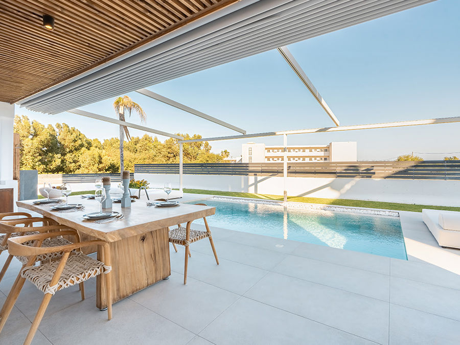 D&R Boutique Villas are modernly designed, 2023 built, fully furnished, and equipped with brand new appliances. Each 2-story villa has a BBQ area, an outdoor heated swimming pool, and a shower with 4 sunbeds. The large outdoor dining area consists of an elegant natural wooden 2.5-meter dining table and 8 wooden chairs. The villas are separated by a 1.8m fence and garden for privacy.