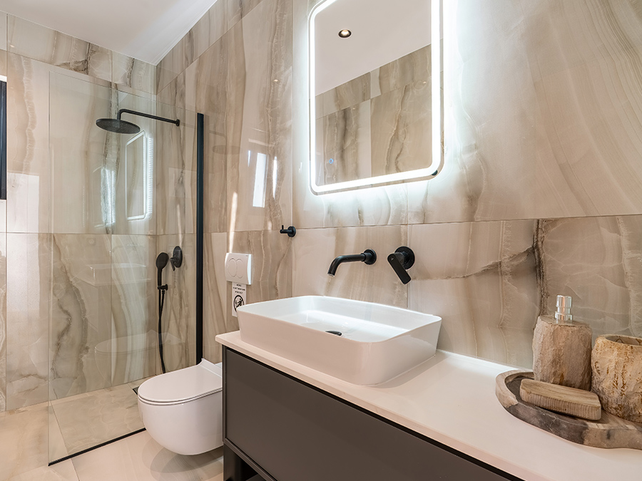 Each villa has 2 bathrooms with all modern amenities, a built in storage space containing the washing machine, an ironing board and other equipment. Each villa has parking spaces, a security gate and cameras.